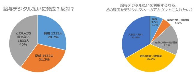 政府が解禁する方針としている、決済サービスなどに賃金を振り込む「給与のデジタル払い」だが、制度に対しどのように考えている人が多いのだろうか。コンサルティング業を営む紀尾井町戦略研究所(東京都杉並区)の調査によると、「利用したい」と答えた人は26.9%に対し、「利用したくない」と答えた人は40.7%であることが分かった。日常生活でのキャッシュレス決済の利用割合の設問では、「7~9割程度利用している」が40.2%で最多となった。続いて「4~6割程度」が22.7%、「1~3割程度」が21.6%とキャッシュレス決済が広く普及している現状がうかがえる。給与デジタル払いの制度については、「賛成」が28.7%、「反対」が31.3%とほぼ同等であるのに対し、「とちらとも言えない」が40%を占め、制度の認知度、理解度が不足している状況がみられた。「賛成」の理由では「給与振込から支払いまでキャッシュレスで手間なく済ませられるから」が、「銀行・ATM手数料の軽減」など他の理由を引き離し6割以上を占めた。一方、「反対」の理由では「現金化するのに手間がかかりそうだから」(46.7%)が最多となり、次いで、「セキュリティー不備による不正引出しが心配だから」(30.9%)に多く回答が集まった。賛否ともに日常生活における利便性を考慮する声が多いようだ。「給与デジタル払いを利用するなら、どの程度をデジタルマネーのアカウントに入れたいか」の質問では、入れたくない(33.4%)を除くと、「給与の1割~3割程度」が35.2%で最多となった。次いで「4割~6割程度」が18.2%と、いずれも銀行口座振込との併用で、給与の一部を入れる形をとる人が多いことが予想される結果となった。インターネットにより18歳以上の男女4580人が回答した。調査期間は5月19日。□<Web調査> 4,580人に聞いてみました「給与のデジタル払いについて、どう思う?」 | 紀尾井町戦略研究所株式会社2021年06月04日 10時24分 公開ITmedia ビジネスオンライン