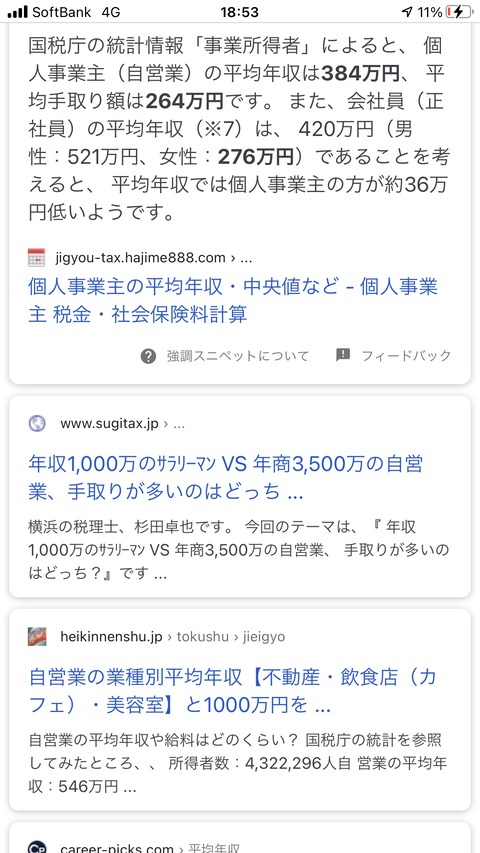 国税庁の統計情報「事業所得者」によると、個人事業主(自営業)の平均年収は384万円、 平均手取り額は264万円です。また、会社員(正社員)の平均年収は、420万円(男性:521万円、女性:276万円)であることを考えると、平均年収では個人事業主の方が約36万円低いようです。画像