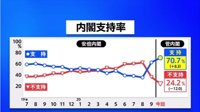 最新のJNNの世論調査で、先月発足した菅内閣の支持率が7割に達したことがわかりました。一方、菅総理が日本学術会議の会員候補の学者6人の任命を見送ったことについては、51%の人が「妥当ではない」と答えています。菅内閣を支持できるという人は、先月の調査結果より8.3ポイント上昇し、70.7%でした。一方、支持できないという人は12.0ポイント減って24.2%でした。調査方法が違うので単純に比較はできませんが、政権発足時の支持率としては1994年以降で4番目の高さです。以下ソース先で5日 1時54分 TBShttps://news.tbs.co.jp/jpg/news4094243_50.jpg