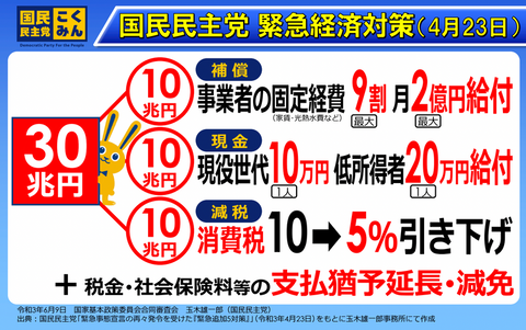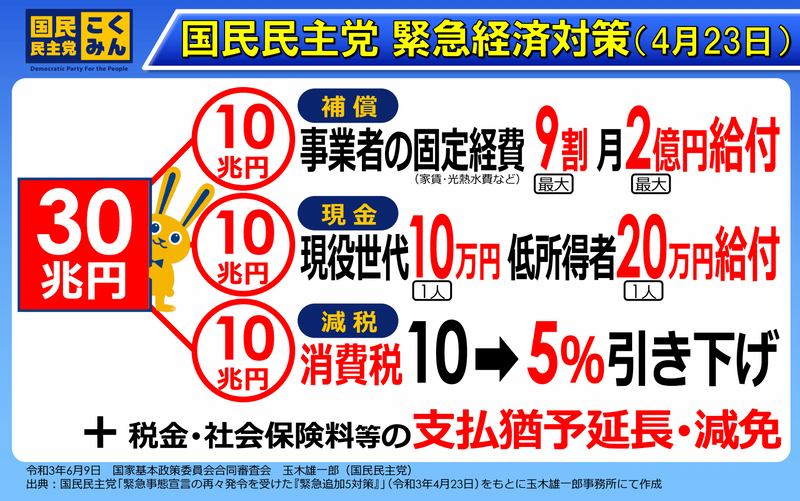 30兆円規模の追加経済対策を首相が指示へ昨日「菅首相、追加経済対策指示へ 衆院選アピール、30兆円規模か」と時事通信が報じた。報道では、首相が緊急事態宣言の拡大といった感染防止策の強化に合わせて国民生活を下支えする追加経済対策の取りまとめを自民党に指示するとしており、衆院選後の臨時国会で2021年度補正予算の成立を図ると見込んでいる。正直、これらの動きは遅いと言わざるを得ない。そもそも、30兆円規模の追加経済対策のうち20兆円規模は補正予算の成立を図らずとも今すぐにできることだ。政府が昨年度に合計3回編成した補正予算(約73兆円)のうち、未だに使い残している20兆円程度について使途目的を閉会中審査で明らかにした上で、直ちに執行すればいいだけの話である。「30兆円の追加経済対策」の必要性は既に4月には言われていたそもそもこの規模の追加経済対策の必要性は今言われた話ではない。今年6月に行われた党首討論では野党国民民主党の玉木雄一郎代表が、緊急経済対策として30兆円の対策を行うべきだと主張していた。上記のパネルはその時に示されたパネルであるが、この30兆円の緊急経済対策パッケージが示されたのは4月23日だ。実に3ヶ月もの間、これらの提言がなおざりになった結果、今から策定をしていては、「遅きに失している」と指摘されるのは当然だろう。