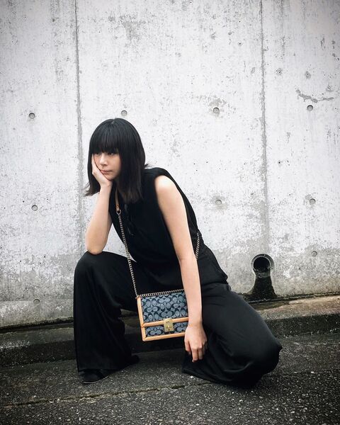さらに、ミディアムの長さのヘアスタイルも黒髪で、前髪が目の上あたりで“ぱっつん”に揃えられているのが印象的。ブランド物のバッグが装いにアレンジを加えている。