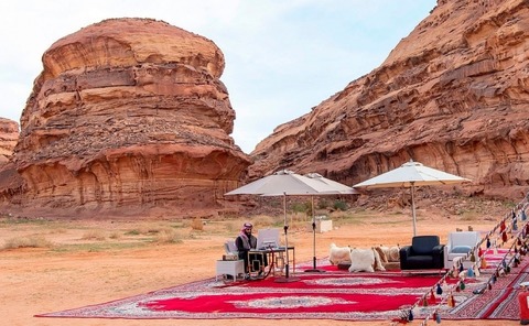 場所は北西部のルーラ砂漠に位置し世界文化遺産に登録された巨大な自然を背景に、屋外に豪華なカーペットとパラソル、ソファなどを配置した。