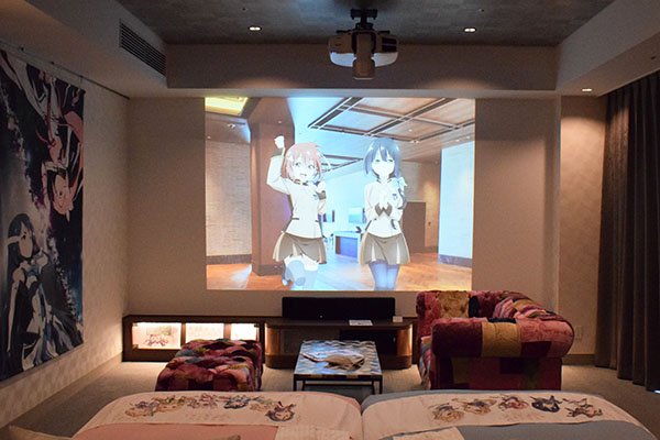 2020年10月1日(木)「結城友奈は勇者である」とコラボしたジュニアスイートルーム。ホテルの制服を着たキャラクターが出迎えてくれる=9月30日午前、所沢市東所沢和田のEJアニメホテル所沢市東所沢和田のところざわサクラタウン内に1日開業するアニメをテーマにしたコンセプトホテル「EJアニメホテル」で9月30日、関係者によるセレモニーが行われた。EJは「エンターテイメントジャパン」の意味で「好きな物語に、泊まる。」をコンセプトにアニメやゲームなどコンテンツの世界観を演出する体験型ホテル。サクラタウン最上階の6階に位置し、5タイプ33室。室料は1泊2食付きプランで1人当たり1万9800円から。オープン時は「結城友奈は勇者である」「宇崎ちゃんは遊びたい!」など5作品のコラボルームが展開される。部屋に入ると、ホテルの制服を着たキャラクターが出迎える。室内は作品のイラストなどで装飾。全客室に150インチの大型画面プロジェクターが設置され、作品の特典映像や名シーンを投影。宿泊特典として、キャラクターによるウエルカムボイスやアニメの世界観と連動したフルコースディナー、ホテル限定の描き下ろしイラストを使用したグッズが用意されている。エレベーターのアナウンスは人気声優の梶裕貴さんを起用。セレモニーに出席した梶さんは「自分の声が世界の皆さんに届くことを誇りに思う」と話していた。