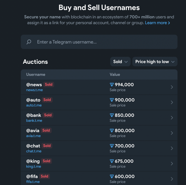FragmentのオークションはThe Open Networkブロックチェーン上で行われるもので、ユーザーはTONトークンを使って支払う。「@news」というユーザー名が最高額として170万ドルで落札された事例もあった。