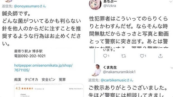 似非フェミ女性「こいつ痴漢を安全ピンで刺すことに反対しやがった! こいつ痴漢推奨魔だ!!この鍼師と鍼院では性犯罪をしてまーす!!」