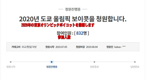 韓国の青瓦台の請願書サイトに「2020年の東京オリンピックボイコットを請願します」というものが