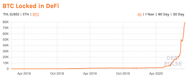 以下のグラフはDeFiにロックされているBTCの数量を表す指標だが、DeFi市場が着目され始めた今年5月以降に急増。ビットコインに連動したERC-20トークンであるWBTC(Wrapped Bitcoin)の成功を含め、BTCのDeFiに対する需要の高さを示唆している。