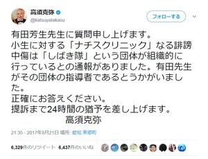 有田芳生先生に質問申し上げます。小生に対する「ナチスクリニック」なる誹謗中傷は「しばき隊」という団体が組織的に行っているとの通報がありました。有田先生がその団体の指導者であるとうかがいました。正確にお答えください。提訴まで24時間の猶予を差し上げます。