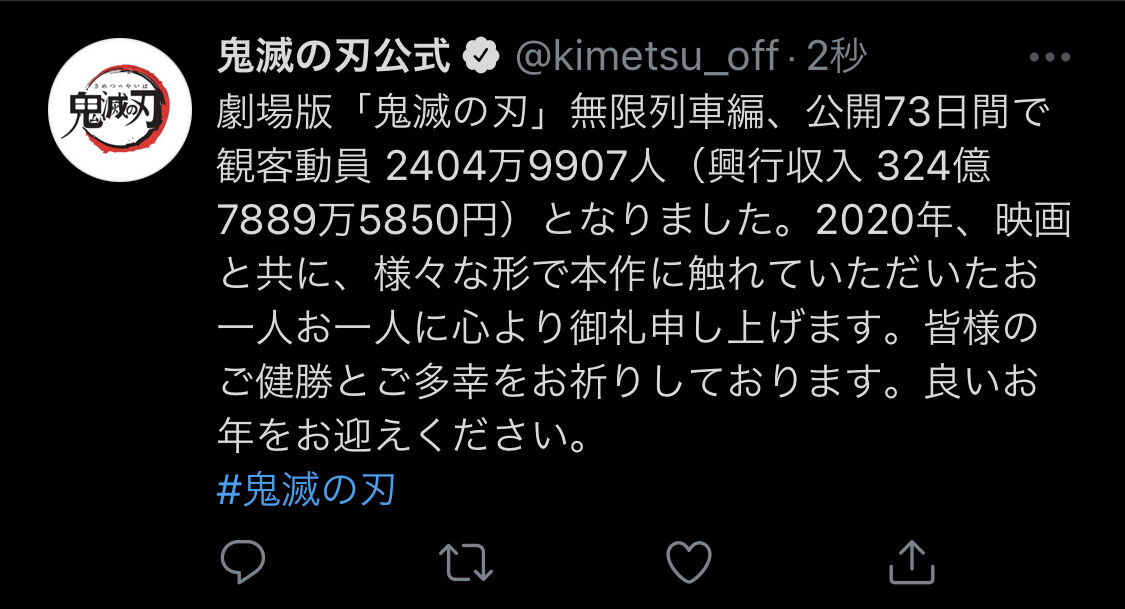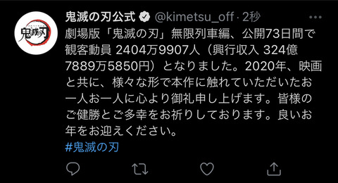 ジャンプ作品 歴代興行収入1位 324億 鬼滅の刃2位 85億 ルーキーズ3位 68億 ワンピース深夜アニメ 歴代興行収入1位 324億 鬼滅の刃2位 28億 ラブライブ3位 25億 ソードアート・オンライン日本全作品興行収入1位 324億 鬼滅の刃2位 316億 千と千尋の神隠し3位 262億 タイタニック