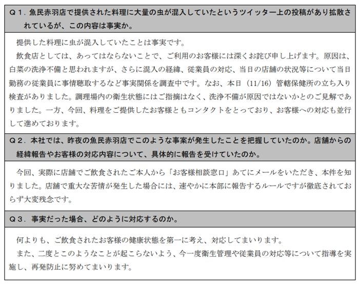 魚民赤羽店を訪れた客が11月15日夜「料理に虫が入っていた」とSNS上で訴えていた件で、