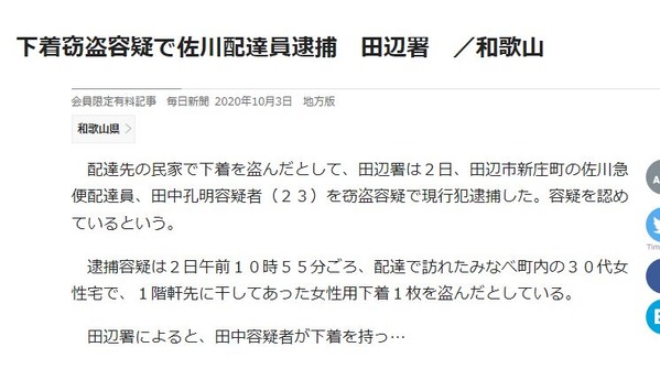 逮捕容疑は2日午前10時55分ごろ、配達で訪れたみなべ町内の30代女性宅で、1階軒先に干してあった女性用下着1枚を盗んだとしている。