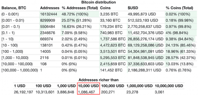 BTCの価格上昇でアドレスごとの保有金額が増える一方で、上記の表によれば、全アドレスのうち48.72%が、BTCの保有数量が0〜0.001BTCとなっている。0.001〜0.01BTCを保有するアドレスの割合は25.05%で、ここまでで全体の73.77%だ。
