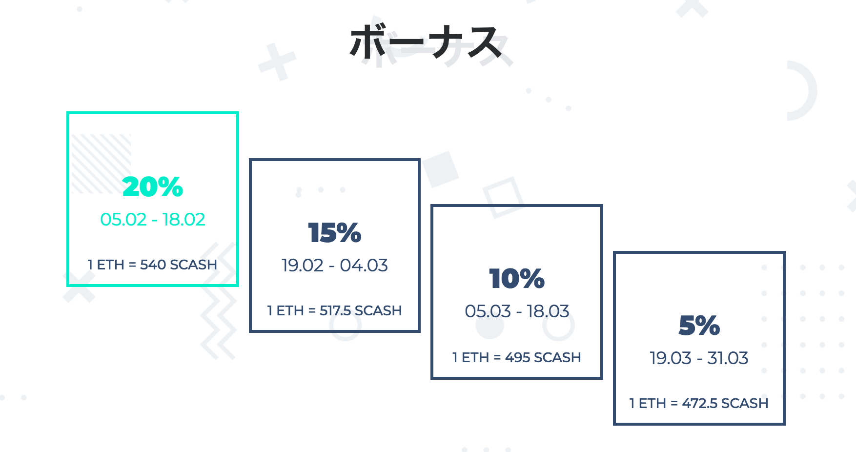 SHIFT.cashのトークンセールは日本時間2月5日17時より開始され、3月31日に終了する。総供給量は5,778,000 SCASHで、取引レートとボーナスは期間により変動する。イーサリアム、ビットコイン、ライトコインでの参加が可能だ。