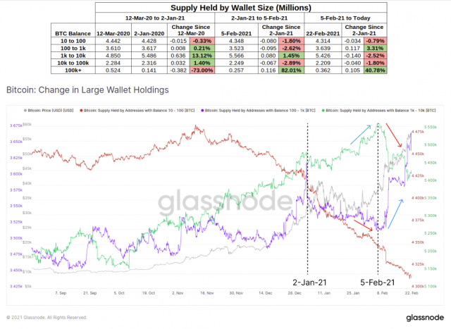 さらに詳細な分析によると、クジラからザトウクジラ(1,000~10,000BTC)は、1月に約8万BTC増加させた一方で、2月に入り14万BTCの減少に転じた。