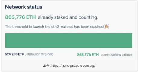 デポジットコントラクト(ステーキング)の閾値の条件(524,288ETH)は11月24日に満たされ、現在863,616 ETHがデポジットコントラクトに入金されている。総額は、540億円を超える。