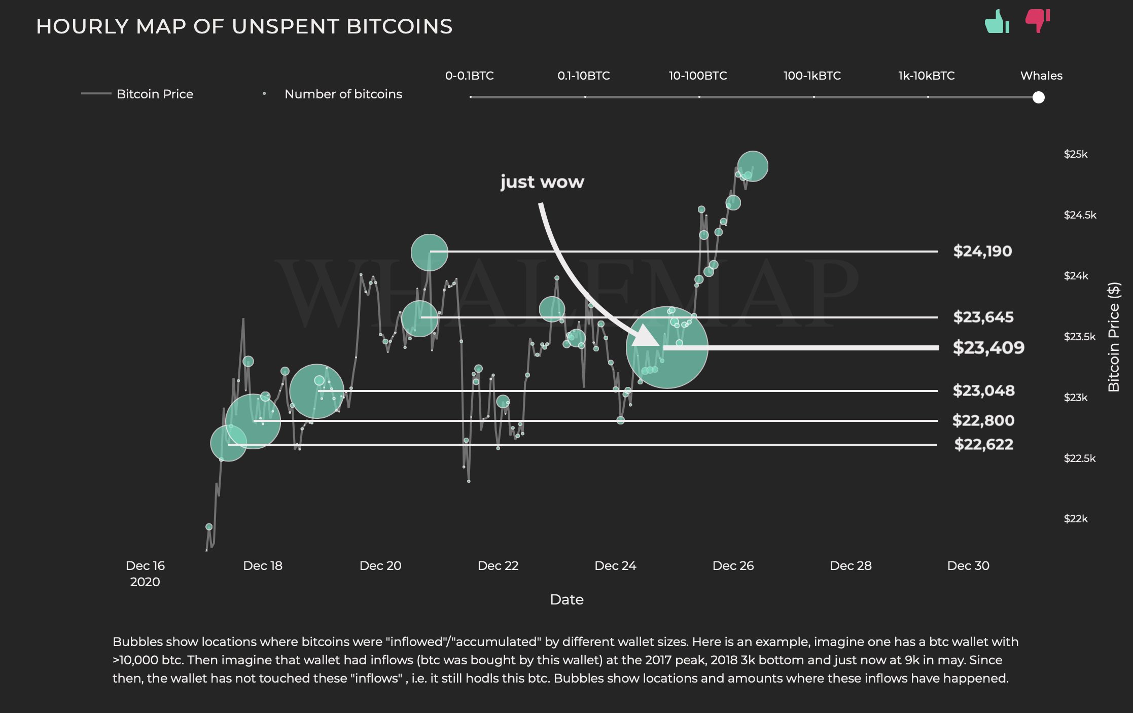 ビットコイン(BTC)のクジラ(大口投資家)が23409ドルに集中していることで、この価格帯が注目エリアであることを示している。現在の強気相場は、クジラによって支えられているようだ。