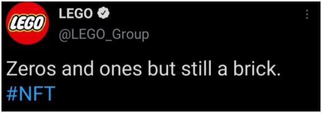 24日にレゴ社の公式ツイッターが、NFTに関する短い動画を投稿した。この投稿はすぐに消去されたが、投稿には「ゼロか1が並んでてもやっぱりブリックだ(Zeros and ones but still a brick)」という文章とともにハッシュタグでNFTがつけられていた。
