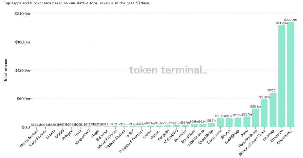 実際、アクシー・インフィニティは、Token Terminalのデータによると、過去30日で2億2000万ドル(約240億円)以上を稼ぎ出し、あらゆるDeFiプロジェクトとブロックチェーンの中でNo.1の収益をあげた。