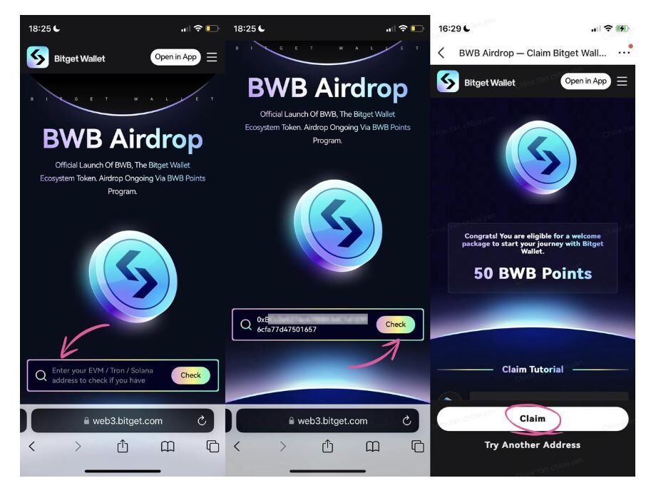 BWBエアドロップの問い合わせページにアクセスし、利用可能なBWBポイントを確認してください。初期ポイントに該当する場合は、Bitget Walletアプリをダウンロードし、ウォレットアドレスをインポートしてください。