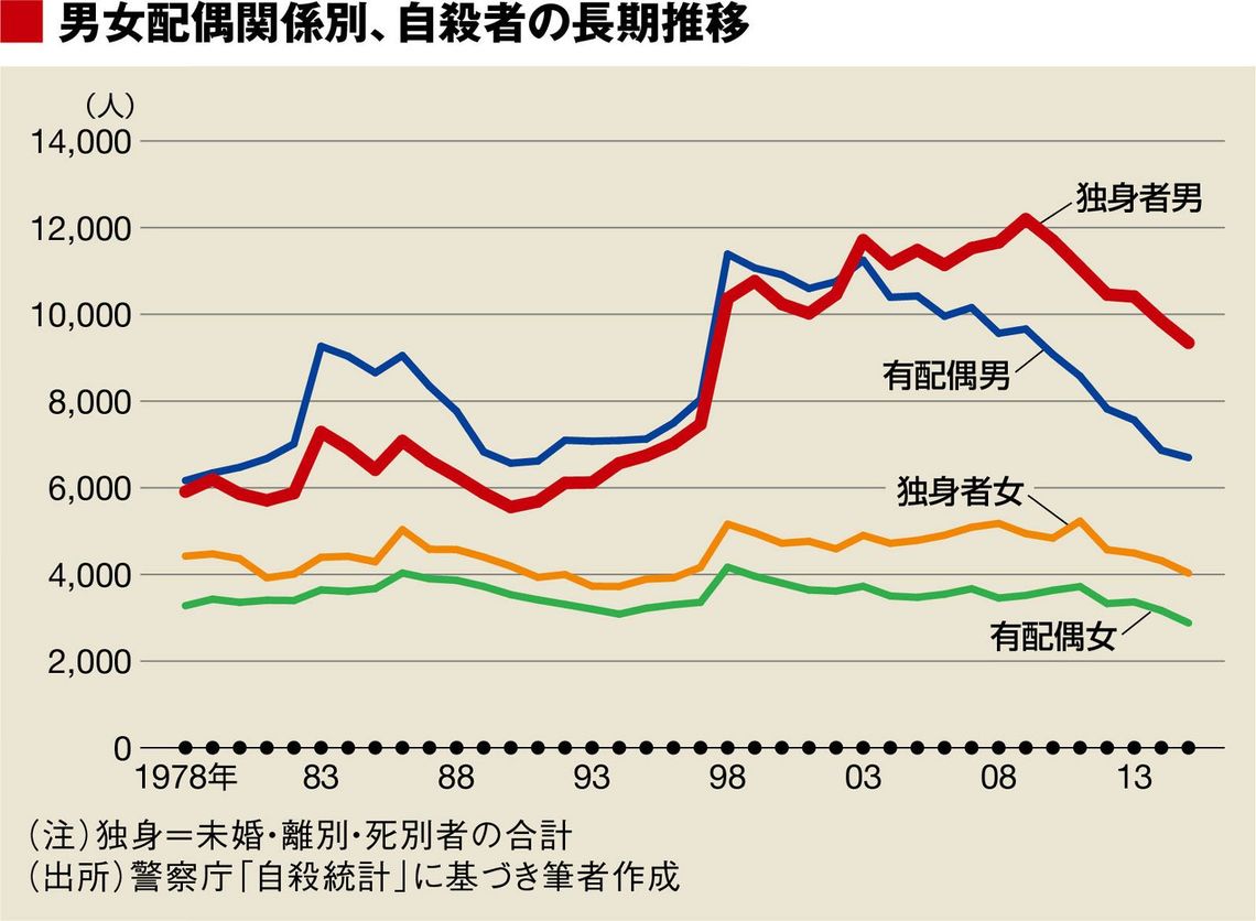 ■2003年に独身男性が既婚男性の自殺者数を超える