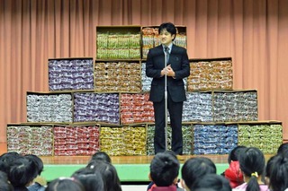 段ボールには定番駄菓子「うまい棒」がぎっしり1万本。児童たちから見えるように並べられており、味も12種類が取りそろえられていました。