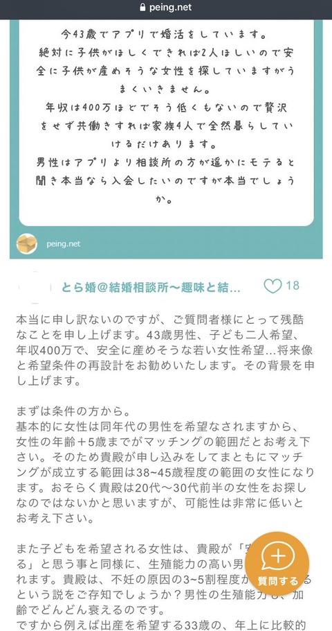 とら婚~趣味を変えず、出逢いを変える結婚相談所~@三大都市支店展開中!@ToraCon_Akiba 本当に申し訳ないのですが、ご質問者様にとって残酷なことを申し上げます。43歳男性、子ども二人希望、年収400万で、安全に産めそうな若い女性希望…将来像と希望条件の再設計をお勧めいたします。その背景を申…