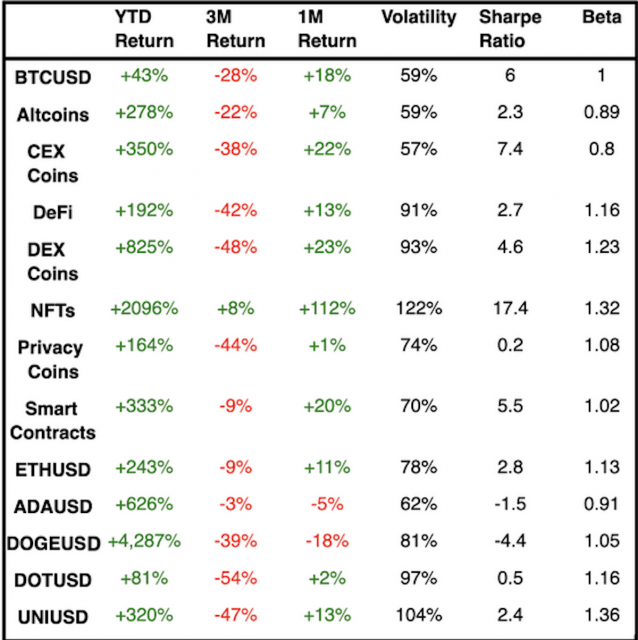 カテゴリー別ではNFT銘柄が+112%の月間騰落率を記録し、市場の活況ぶりをうかがわせる結果となった。シャープレシオはビットコインの6を大きく上回る17.4に達した。