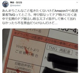 その不在票を受け取ったという人物のTwitterによると、家の呼び鈴が鳴ったため玄関を開けに行こうとしたところ、玄関の方からドアを殴ったり蹴ったりしているような凄まじい音が聞こえてきたといいます。恐怖で玄関を開けることが出来なかったそうですが、呼び鈴の主はAmazonの商品を届けに来たTMGという配送業者だったようです。そして、その配送業者が血だらけの不在票が置いていったと語っていました。