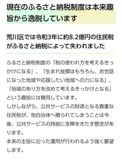 【悲報】荒川区「現在のふるさと納税制度は本来の趣旨から逸脱しています😡」」