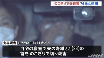 のこぎりで83歳夫を殺害…76歳女逮捕「馬乗りになり、のど仏を切り、死んでいく様子を2時間程見ていた」