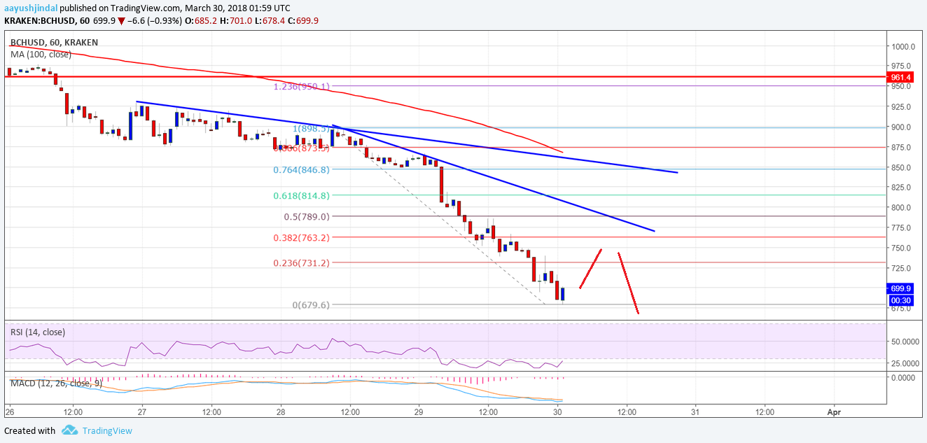 ありました売り圧力の増加の多くはドルに対してビットコイン現金価格の$、750サポート以下のプッシュが得られ、。価格は大幅に下がり、さらに700ドルの水準を壊しました。軽微な修正が開始された場所から679ドルで最低が結成されました。現時点では、価格は750ドル水準と100時間の単純な移動平均を大幅に下回っています。