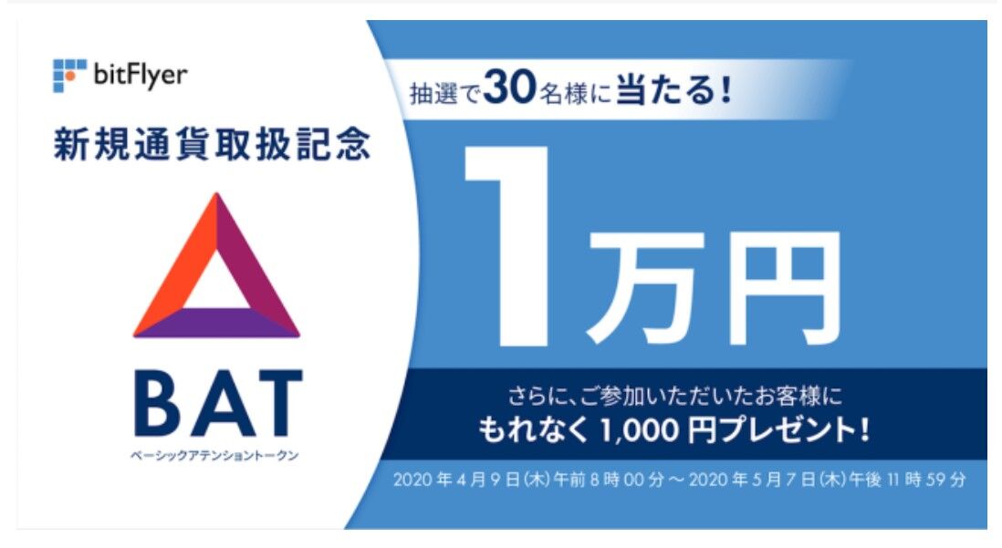 BATの取扱い開始を受け、キャンペーンも開催。キャンペーン期間中に、販売所で合計400BAT(1BAT=18.24円:7300円相当)以上を購入したユーザーを対象に、抽選で30名に10,000円。合計で4,000 BAT以上購入したユーザーは、もれなく1,000円のキャッシュバックする「BAT取扱開始記念!抽選で10,000円プレゼントキャンペーン」を実施する。