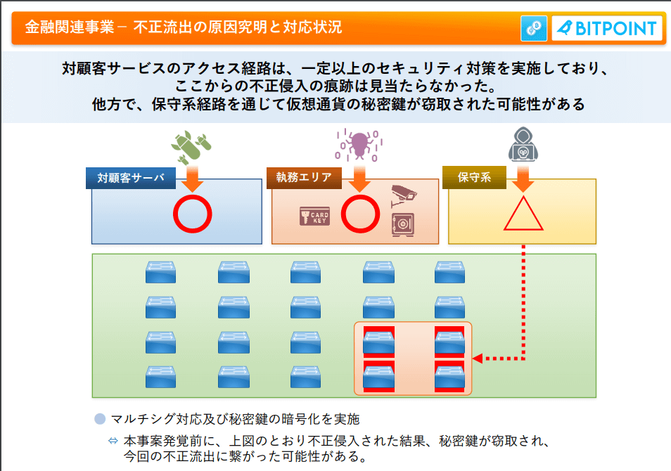 対顧客サービスのアクセス経路は、一定以上のセキュリティ対策を実施しており、ここからの不正侵入の痕跡は見当たらなかった。 他方で、保守系経路を通じて仮想通貨の秘密鍵が窃取された可能性がある。