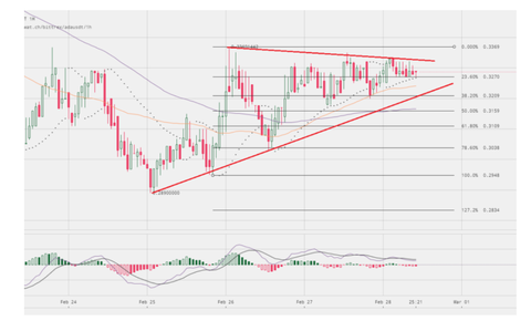 最近下降訂正が開始されたところから0.33669で形成された高値が最近ありました。ADAは下落し、最後の波の50%Fib retracementレベルを下回る0.2948ドルから0.3370ドルの高値に下がった。下振れは$ 0.3000のサポートによって保護されました。さらに、$ 0.2948の低水準から$ 0.3370の高値までの最後の波の76.4%Fib retracementレベルもサポートとして機能しました。現在の価格構造である正の $ 0.3200レベル以上。ADA / USDペアの時間割チャートで0.3330ドルで抵抗する主要な契約三角形があるようです。