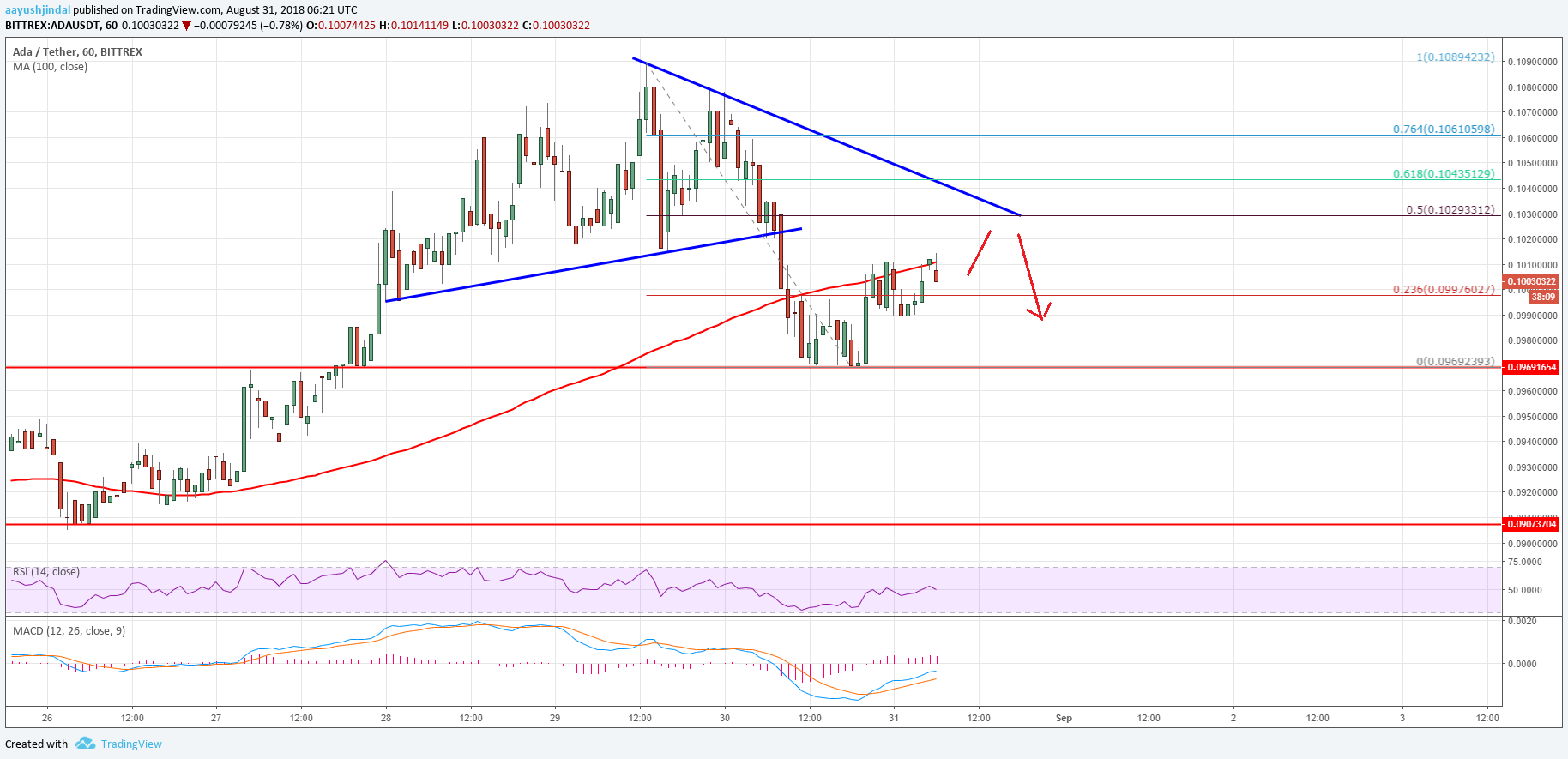 - ADA / USDペア(Bittrex経由のデータフィード)の時間割チャートで0.1030ドル近くの支持を得て、好調なトレンドラインを下回った。