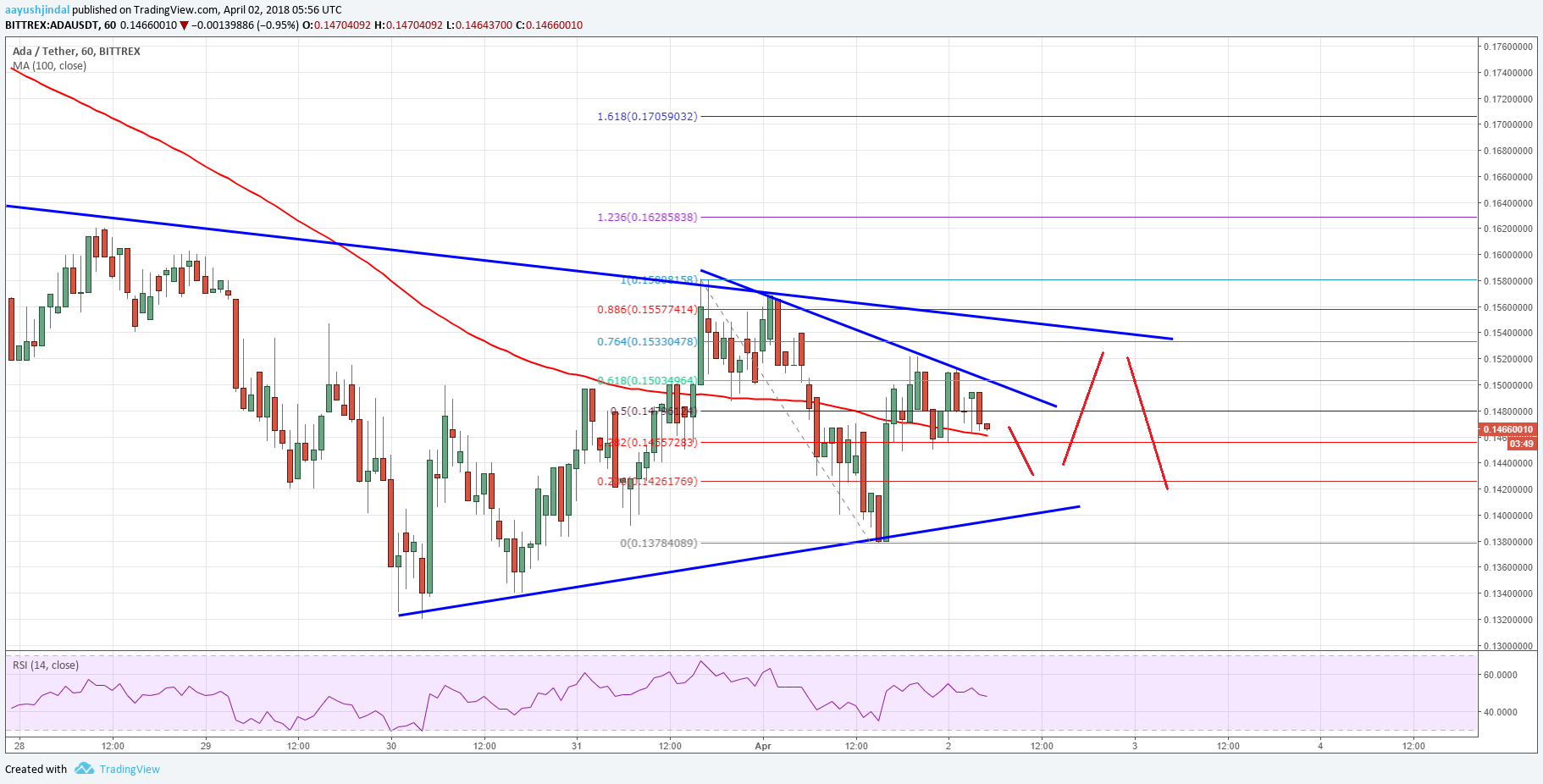 これは最後の下振れの38.2%Fib retracementレベルを0.1589ドルから0.1378ドルに高めた。しかし、上昇の動きは0.1500ドル水準で保護されていた。さらに、最後の下振れの61.8%Fibリトレースメントレベルは、0.1589ドル高から0.1378ドル下落へと抵抗した。現時点では、主要な契約三角形が形成されており、ADA / USDペアの時間別チャートでは0.1540ドルで抵抗しています。このペアはさらに回復するために0.1540ドルと0.1550ドルの抵抗水準を上回らなければなりません。