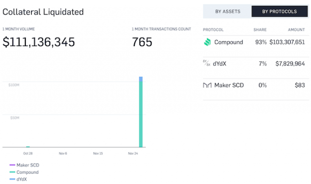 DeFi(分散型金融)のレンディングプラットフォームCompoundで、1億ドル(約100億円)規模の強制清算が行われたことが分かった。