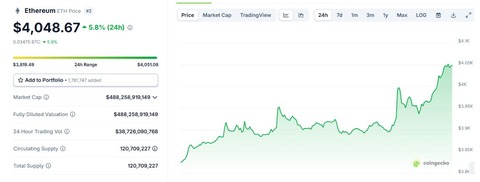 イーサリアム (ETH) は、6月後半に始まったデジタル資産への関心が続く中で、12月9日以来初めて$4,000を突破しました。データによると、ETHは8月8日1:20 p.m. EST に$4,050で取引され、24時間で約6%、7日間でほぼ10%の上昇を見せました。