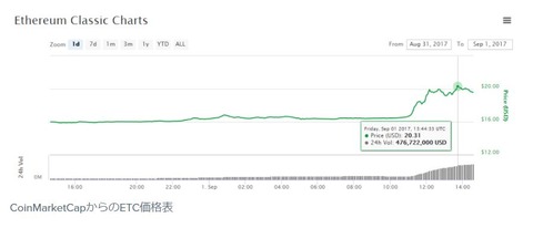 しかし、それは9月1日に変更され、ethereum classicは8月の急落の後に上がり始めました。価格上場の最初の兆候は、ETCの取引量と価格の両方が上向きになった前夜であった。UTCの1:00までに、24時間の量は1億ドルに増加し、ethereum classicは17ドル近くで取引されていました。Ethereumの古典は引き続き蒸気を拾い上げ、11:00 UTCに、ETCが急上昇し始めた。1時間以内に、ethereum classic価格は$ 20からちょうであり、毎日のボリュームは3億ドルに増加しました。少しの上昇の後、ethereumの古典的な価格は約14:00 UTCの20ドルのマークを超えて上昇した。現在、ethereum classicはグローバル平均で20.03ドルで取引されており、毎日23%の増加となっています。この進展によりエテリアム・クラシッethereum classicクの時価総額は19億ドルに増加し、