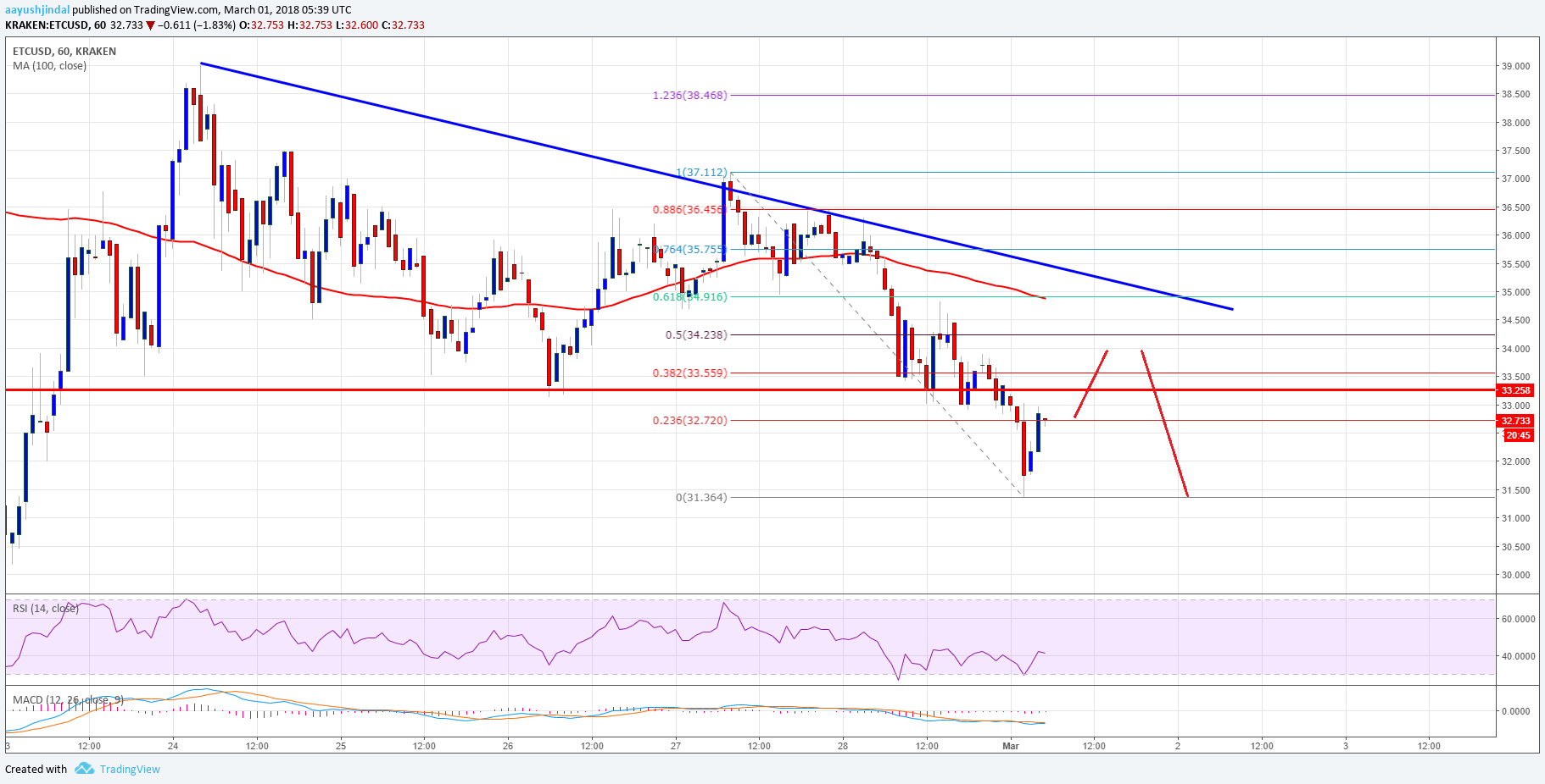 新鮮な欠点波は、米ドルに対するETC価格でも$ 37.00の上から開始されました。価格は下落し、$ 35.00や$ 34.00といった重要な支援レベルの下で取引されました。それは$ 33.25のサポートの下で取引さえされ、100時間の単純な移動平均の下で落ち着いた。それは31.36ドルの低価格で取引されており、現在は高値を修正している。