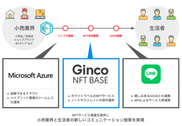 共同プロジェクトでは、LINEのAPI、マイクロソフトのクラウドサービス、GincoのNFTサービスを連携させて、小売業界(小売店、百貨店、ECストアなど)におけるNFTの活用を支援していくという。