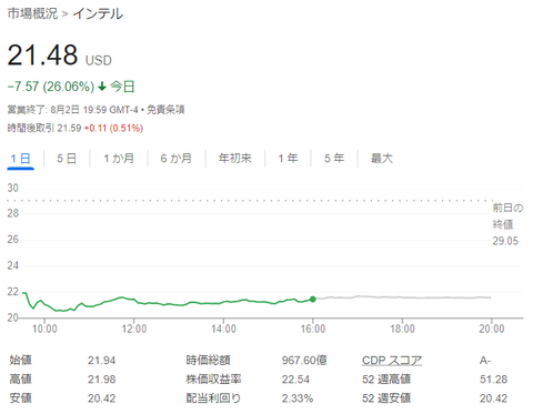 【シリコンバレー=清水孝輔】米インテルの株価が2日の米株式市場で前日終値に比べ約26%下落した。前日に発表した業績悪化と1万5000人の人員削減を受け、売りが広がった。同社の時価総額は1日で4分の3に目減りし、株式市場全体で売りが膨らむなか「インテル・ショック」とも言える状況になっている。