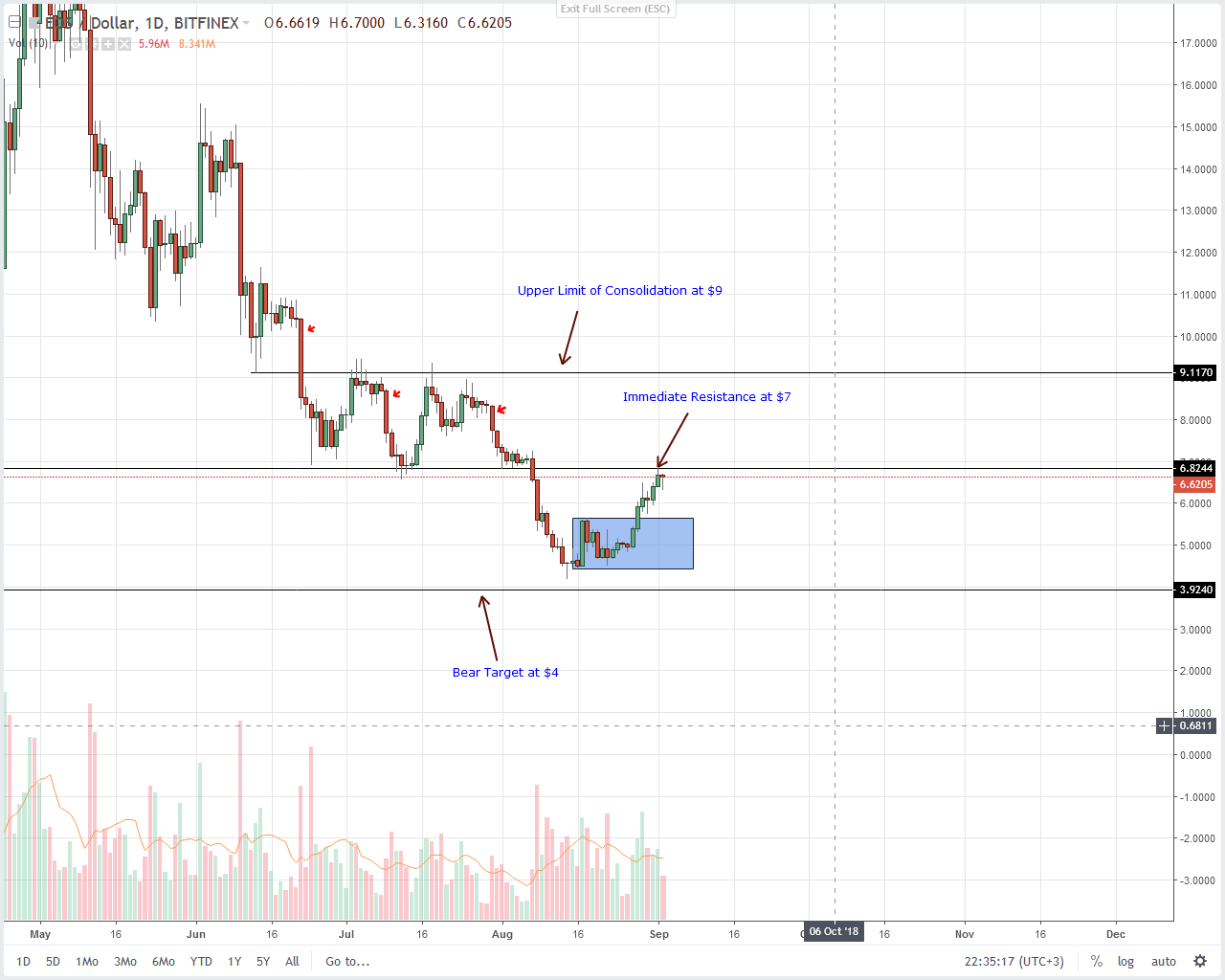 リスク・オン・トレーダーは、一般的な強気の圧力と同期するため、より低い時間枠でディップでロングを拾うことができますが、私たちは最後のEOSトレードプランに沿って、当面の抵抗線を7ドル以上で終えるまで忍耐強くお勧めします。