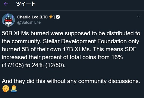 Stellarが550億XLMをコミュニティに無断でバーンしたことについて、Litecoinの創設者であるチャーリー・リーは550億XLMのうちStellar財団のXLMは50億XLMだけであり、これによって財団がもつXLMの割合は17/105(16%)から12/50(24%)に急増しているため、これを無断で行うことに対して批判している。
