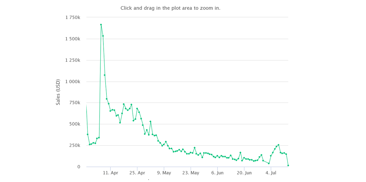 Axie Infinityの開発企業「Sky Mavis」の共同設立者Jeff Zirlin氏は、過去24時間(7日)のAxie NFTの販売数は2,2000体となり、数週間前の7000体に対して3倍に拡大したことを指摘。6月末のRoninブリッジの復旧等に触れて、プロジェクトの傷が「癒えてきた」と強調した。