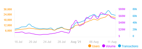 また、過去30日間のデータを見ても、取引高は11億ドル(約1,200億円)を超え、トランザクション数も121万に達している。