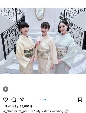 人気音楽ユニット・Perfumeの「あ~ちゃん」こと西脇綾香(34)が、5月22日に自身のインスタグラムを更新。実の妹でタレントの西脇彩華(30)の結婚式に出席したことを報告し、晴れやかな着物姿も披露した。