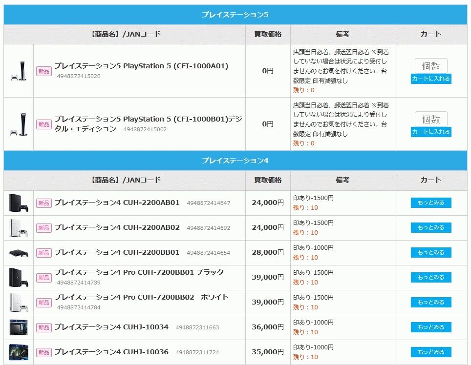 買取屋の価格表 (11/13午前)