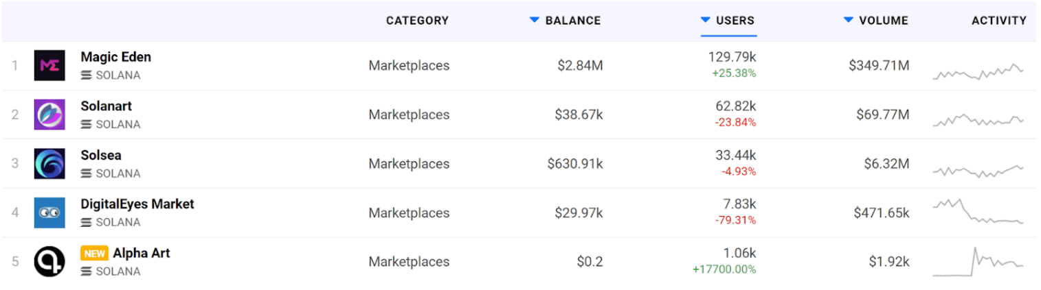 ソラナで発行されたNFTを取り扱うマーケットプレイスが続々と登場しています。ダップレーダー(DappRader)などでソラナのNFTマーケットプレイスの取り扱い高ランキングなども見ることができます。執筆時点でDappRaderのデータは下記の通りです。