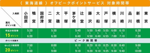 Suica定期券の時差通勤でポイント付与。JR東日本「オフピークポイント」開始臼田勤哉2021年3月15日 00:00JR東日本は、Suica定期券を使った時差通勤でポイントが貯まる「オフピークポイントサービス」を3月15日から開始する。平日朝のピーク時間帯前後の時間帯に、対象エリアの駅でSuica通勤定期券で入場すると、JPE POINTを付与するサービス。出場も対象エリア内である必要がある。ポイント付与により利用者に時差通勤を促す狙いで、期限は2022年3月31日まで。ポイント還元対象時間帯は、ピーク時間帯1時間半の前後1時間。前1時間の「早起き時間帯」では15ポイント、後1時間の「ゆったり時間帯」では20ポイントを還元する。ポイント還元対象時間帯は駅によって異なり、例えば東海道線の「平塚」の場合、5時30分~6時30分が早起き時間帯(15ポイント付与)、8時~9時がゆったり時間帯(20ポイント)となる。「横浜」の場合は、6時~7時が早起き時間帯、8時30分~9時30分がゆったり時間帯。同日に複数回利用した場合でも、還元は1回分のみ。